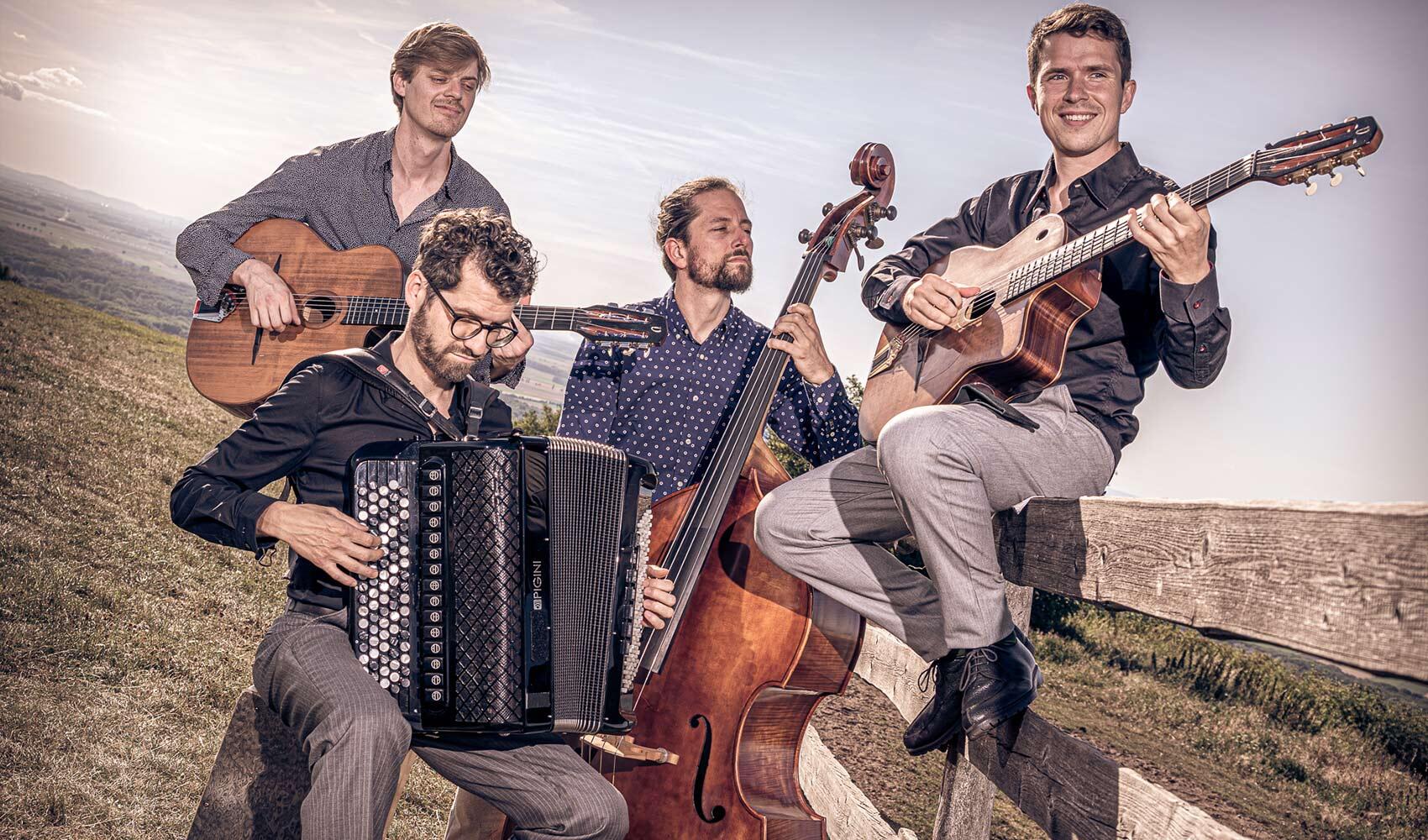 Diknu Schneeberger machte sich als Gitarrist schon früh einen Namen in der Welt des Gypsy Jazz und ist dort schon längst nicht mehr wegzudenken. Unterstützt von Julian Wohlmuth an der Gitarre und Martin Heinzle am Kontrabass garantiert dieses eingespielte Trio einen wahren Hörgenuss. Wenn dann ein Akkordeonist vom Kaliber eines Christian Bakanic diese Band bereichert, entsteht ein wunderbares musikalisches Abenteuer. Dieses Ensemble kombiniert Gypsy Jazz mit Balkanklängen und bringt durch argentinisches Feuer und Wiener Charme eine völlig neue Welt hervor. Im Programm stehen, neben selbst arrangierten Standards, zahlreiche Eigenkompositionen die durch ihre persönlichen Noten und unterschiedlichen Rhythmen für Abwechslung sorgen. Mit viel Spielfreude und Virtuosität sorgen diese hervorragenden Musiker für gute Stimmung und Begeisterung, sodass man seinen Alltag vergessen und vollkommen in diese musikalische Reise eintreten kann.