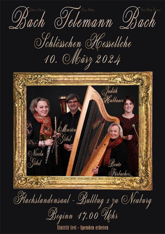 Die Flötistin Nicola Göbel, Martin Göbel am Cembalo, Beate Fürbacher an der Harfe und Judith Hubbauer mit Flöte und Marimba werden mit einem anspruchsvollen Programm, getitelt "Bach Telemann Bach" im Schlösschen Hessellohe auftreten.
