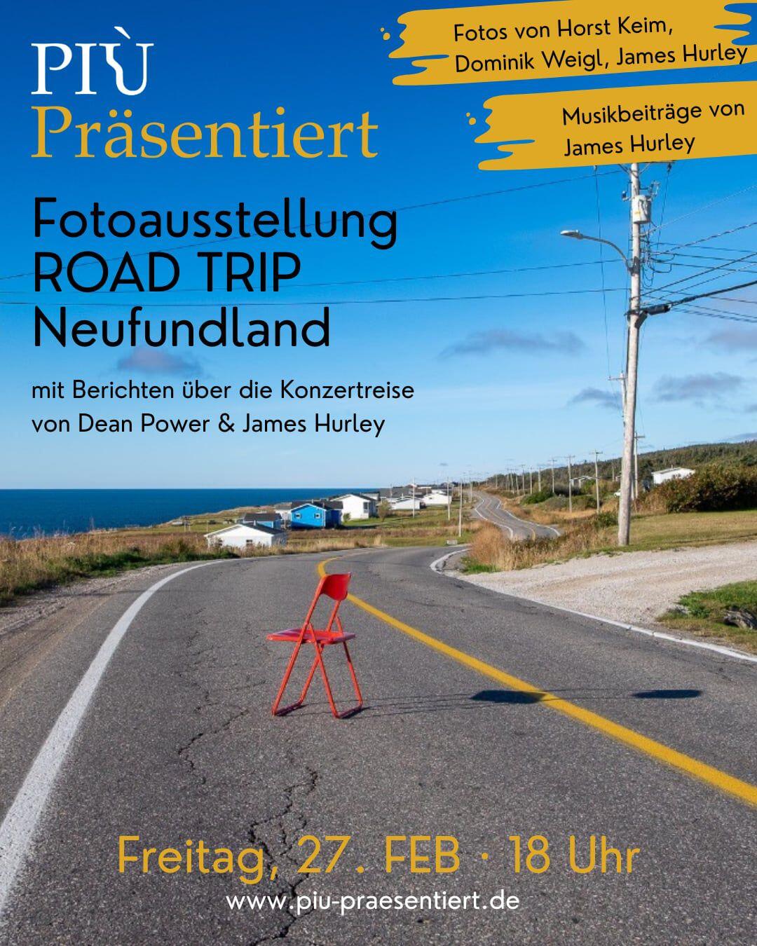 Die Ausstellung zeigt eindrucksvolle Momentaufnahmen einer besonderen Reise durch Neufundland. Gezeigt werden Fotografien von Horst Keim, Dominik Weigl und James Hurley von ihrer gemeinsamen Reise an diesen magischen Ort im Herbst 2025. Anlass dafür war die Konzerttournee von Dean Power und James. Berichte und Fotos geben Einblicke in das Leben on the road – zwischen Musik, Menschen und Orten. Musikalische Beiträge von James begleiten den Abend und schaffen eine atmosphärische Verbindung zwischen Bild, Klang und Geschichte.