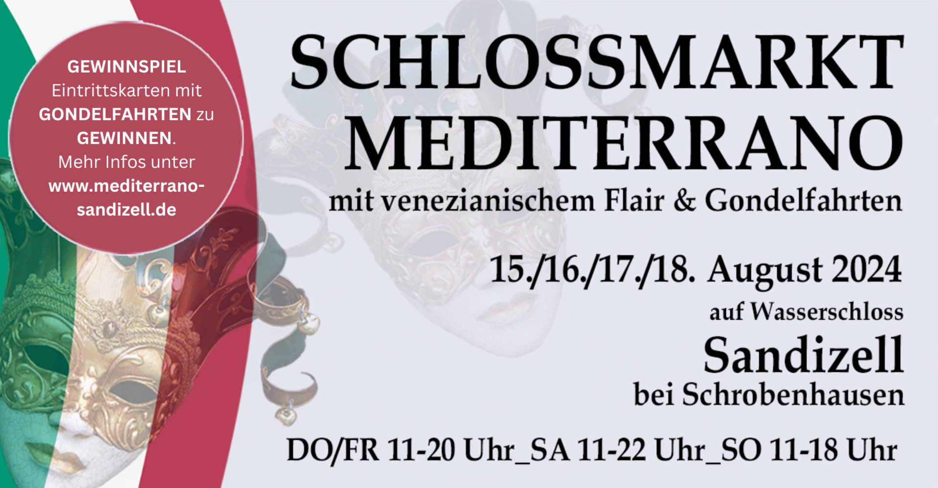 Südländischer Erlebnismarkt für die ganze Familie rund um das märchenhafte Wasserschloss mit venezianischen Gondelfahrten, Maskenzauber und vielem mehr. Für alle die das Mediterrane, südländische Temperament lieben! Lassen Sie sich auf diesem außergewöhnlichen Verkaufsmarkt vom mediterranen Flair verzaubern mit italienischer Kunst, Musik & aktueller Mode. Venezianische Gondeln, Maskenumzug, Clowns und Szenen aus der „Commedia de’l Arte“ zu Wasser und zu Lande! Tarantella und ein musikalisches Feuerwerk der sizilianischen Folklore machen Musiktheater. Händler bieten u.a. mediterrane Delikatessen wie Wein, Käse, Früchte und traditionelle Gelato-Sorten an. Blumen, Teracotta, italienisches Mobiliar, Liebenswerte Kleinigkeiten und auch die neuste Mode wartet auf sie beim Flanieren gleich am nächsten Stand.